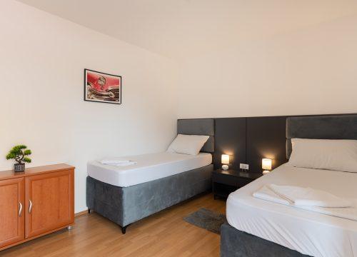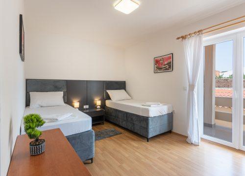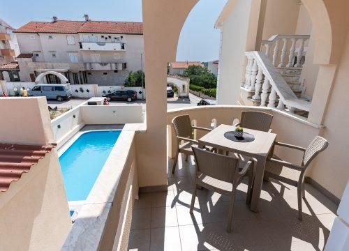 Villa Royal 2 with a swimming pool is located near the town center and right next to the large Plodine supermarket. It is newly renovated, and the apartment consists of two bedrooms, a kitchen, a bathroom, and a balcony. The villa contains three apartments for 4 people each, three apartments for 6 people each, and one apartment for 6 people located in the basement. All guests of the villa have access to the swimming pool. The villa is excellently positioned close to all important places in Novalja, including restaurants, shops, cafes, and the bus station for Zrće. The address of the villa is Zadarska 35, Novalja.